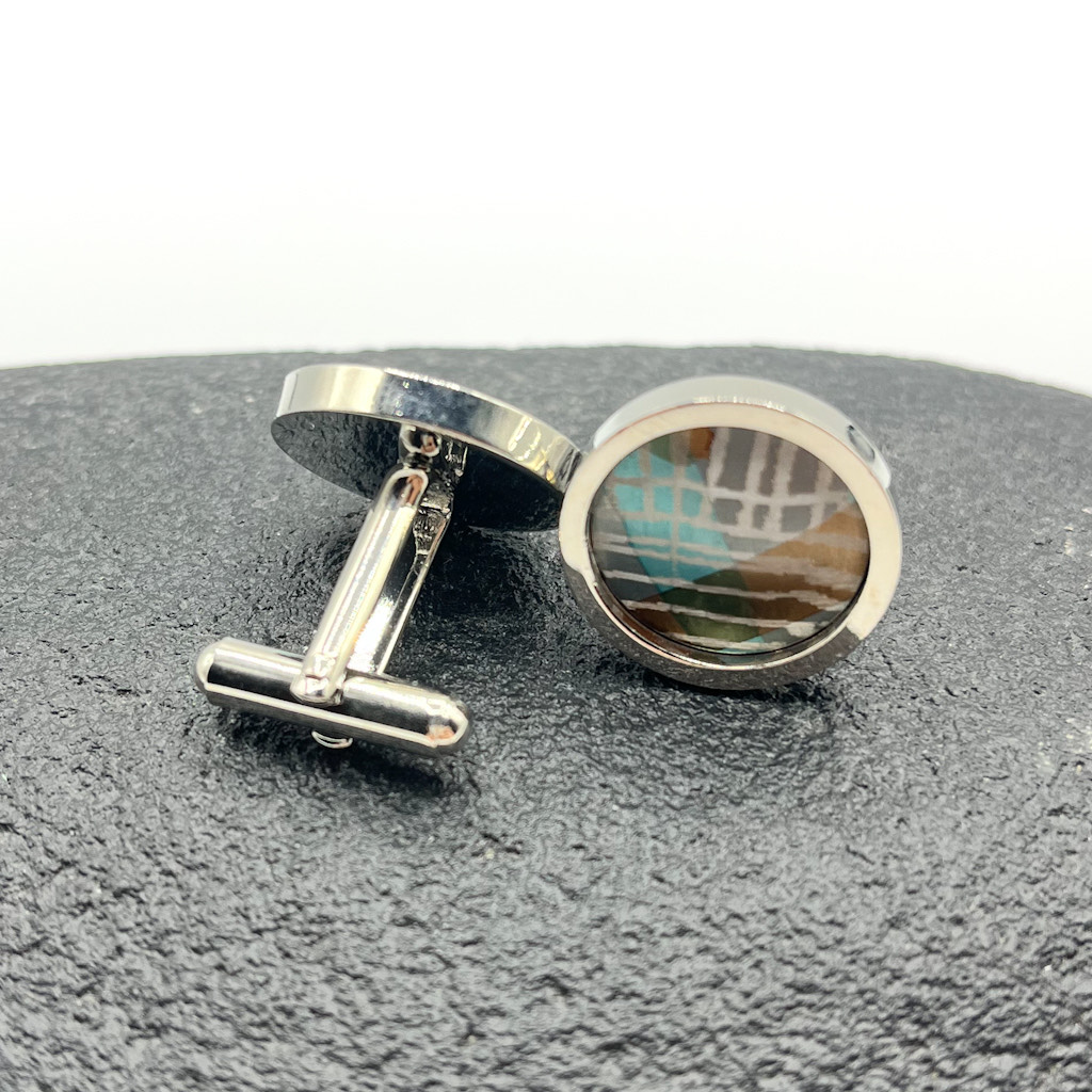 Original round aluminium cufflinks with a grey, blue and brown design by Mandy Nash measuring 2 x 2cm.